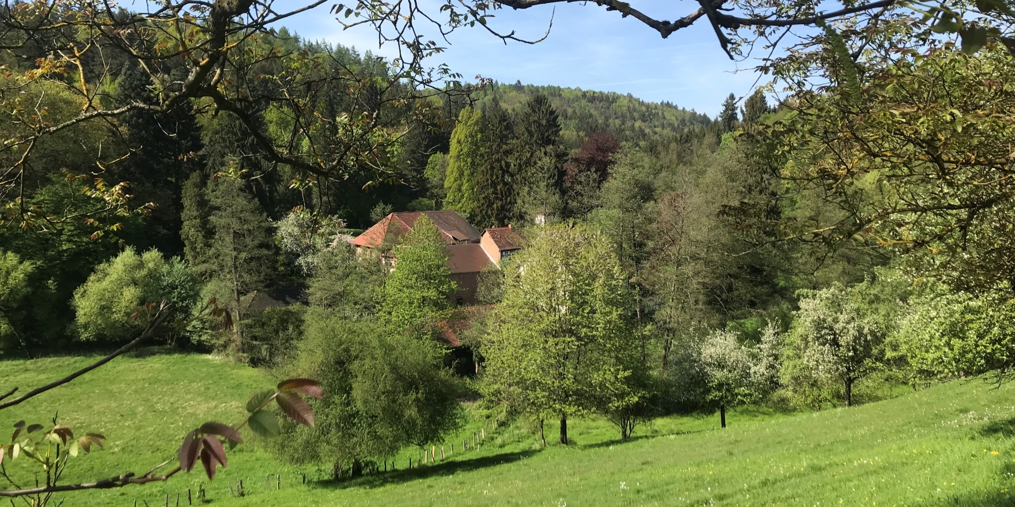 Zum angrenzenden Wald überquerst du nur ein Sträßchen und eine kleinen Wiese und schon bist du im tiefsten Spessart.